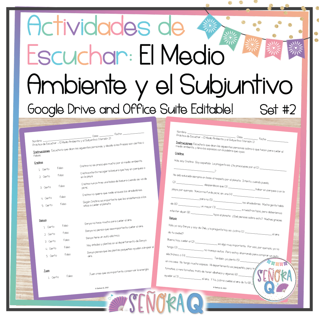 I totally get it if the idea of sorting through video and audio files seems daunting – there’s so much material out there! I’ve sifted through a lot of it and have come up with two sets of audio activities, each set featuring five different videos/audios featuring native Spanish-speakers discussing the environment! Grab them below – lesson plans = done!
