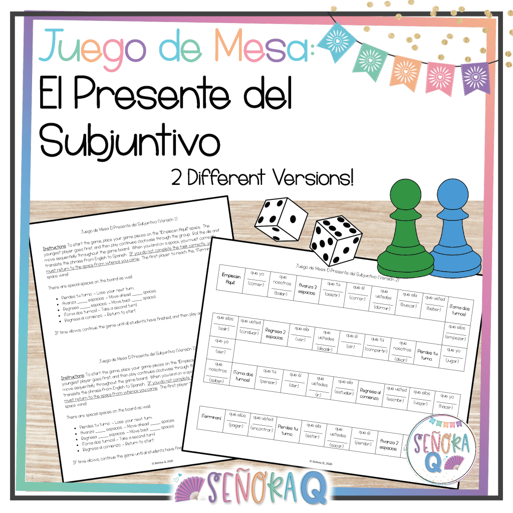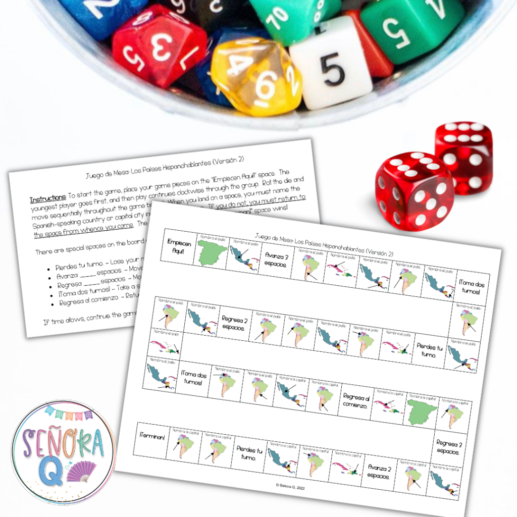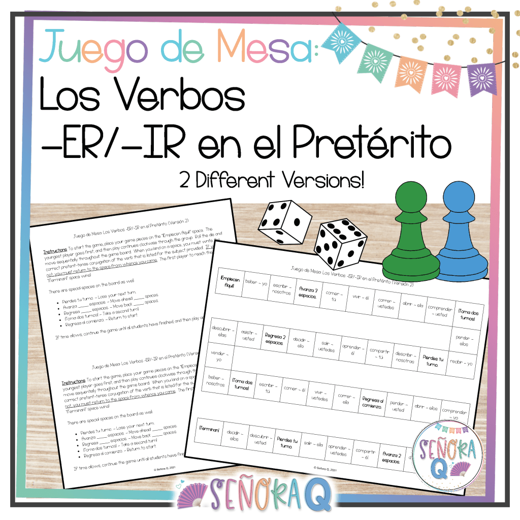 Board games have been a fantastic way for students to practice virtually any concept!! Many years ago, I created a template on Microsoft Word by creating a table and removing the gridlines of the boxes I didn’t want to use until I made a winding path. Then, I fill the spaces with a verb to conjugate, a sentence with a blank to fill in, a question to answer, a picture to identify, or whatever will reinforce the content of the unit! I also add special spaces, like “Lose a turn” or “Move _____ spaces forward/back.”