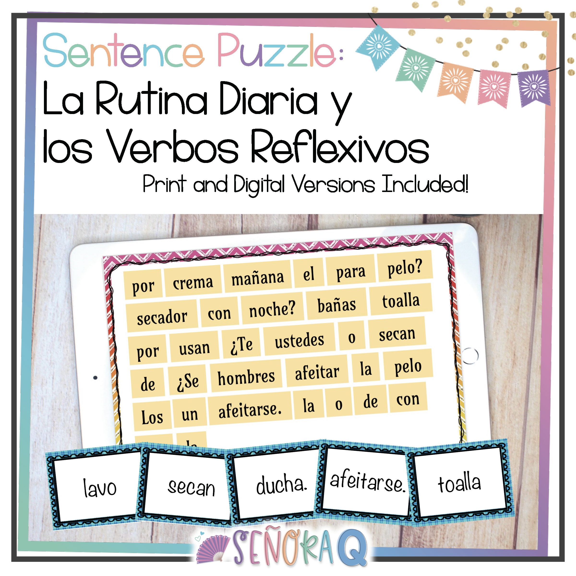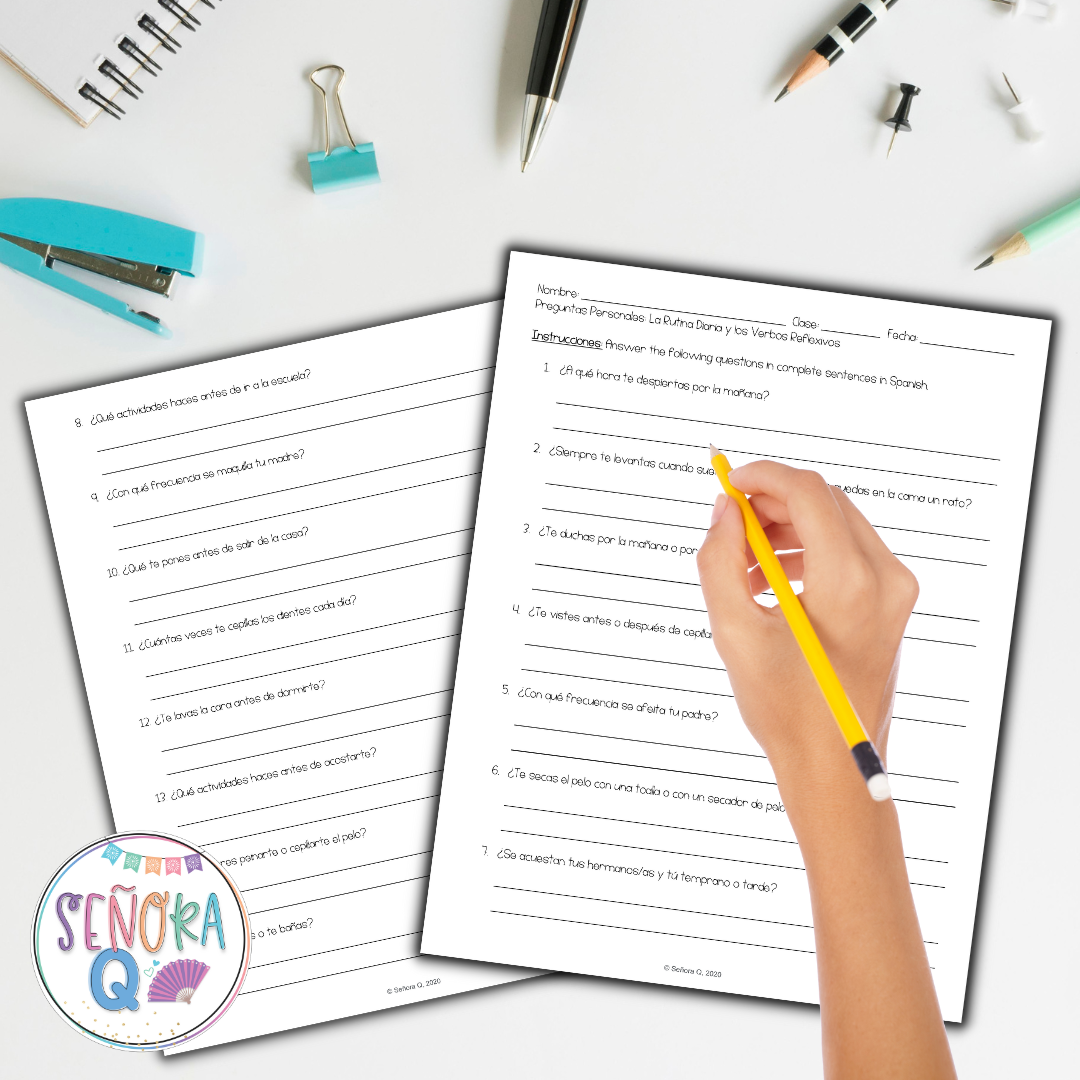 Preguntas Personales. This is an easy yet effective way to practice daily routine and reflexive verbs! Post 2-3 questions on the board or give each student a slip of paper with the questions. For example, ¿A qué hora te despiertas cada mañana? or ¿Qué hace tu hermano/a después de levantarse? I like to vary the subjects of the questions. You could also have students use the questions to interview a partner! Here’s a list of 15 editable preguntas personales on daily routine and reflexive verbs for you!