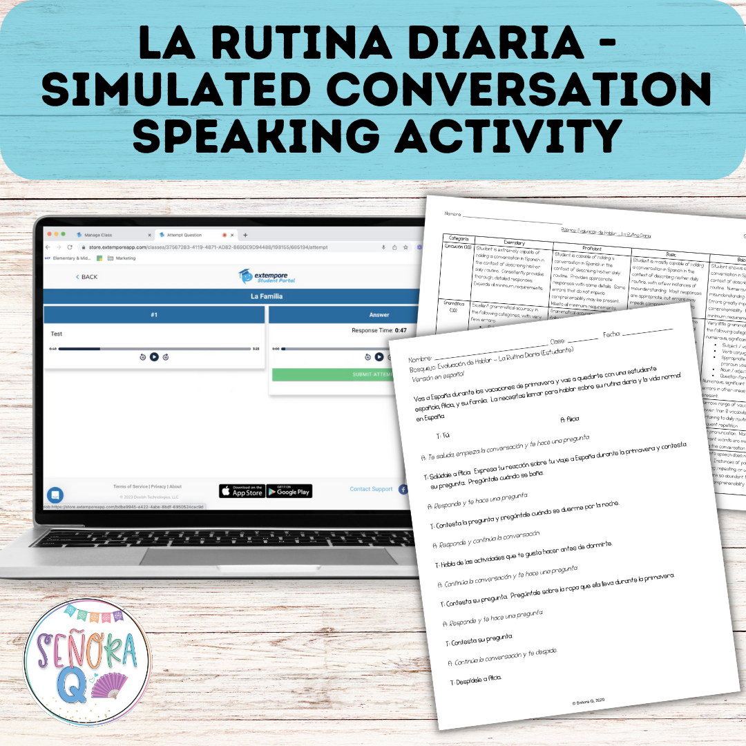 Interpersonal Speaking (Simulated Conversation) Activity. In this activity, students participate in a pre-recorded conversation and respond to questions/prompts on daily routine! First, write your script – what questions/prompts are students going to listen and respond to? Then, make your recording, making sure to leave some time (20-30 seconds or so) between each question/prompt so that students can answer. When I’m ready to do this activity in my classroom, I always provide my students with a conversation outline (but not a transcript) to guide them through the activity. Then, I have my students record the conversation. This is a fantastic way to assess students’ abilities to hold a conversation on a familiar topic in Spanish!