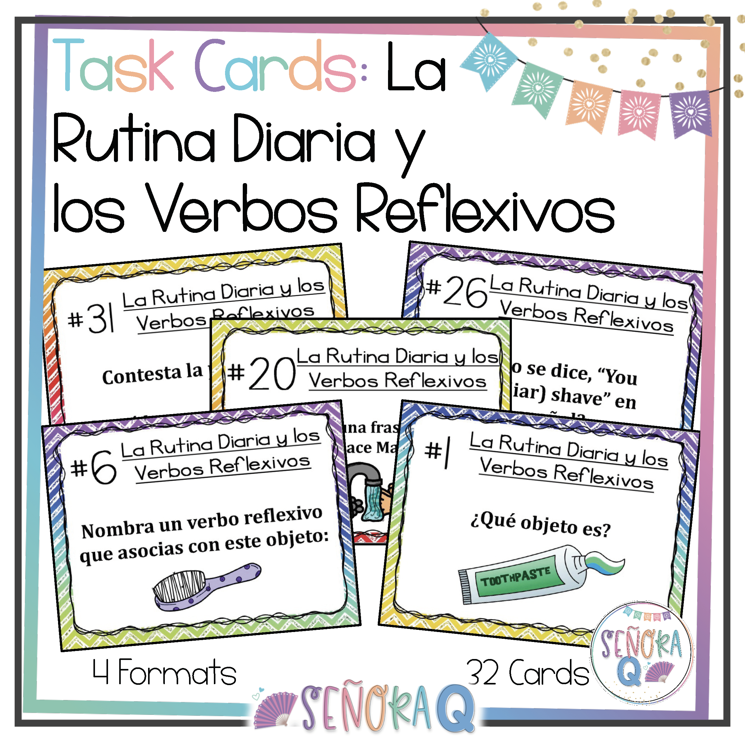 Task Cards. On an index card, write a question/prompt pertaining to daily routine and reflexive verbs. You can number the cards if you like, or include images! There are SO MANY uses for task cards, but my favorite is to post them around my classroom or in the hallway just outside my room and have my students move around to answer the questions. Students really enjoy being able to move around as well! If you’re interested, you can save time and grab these ready-made task cards on daily routine, complete with a student answer sheet, and can use them ASAP!