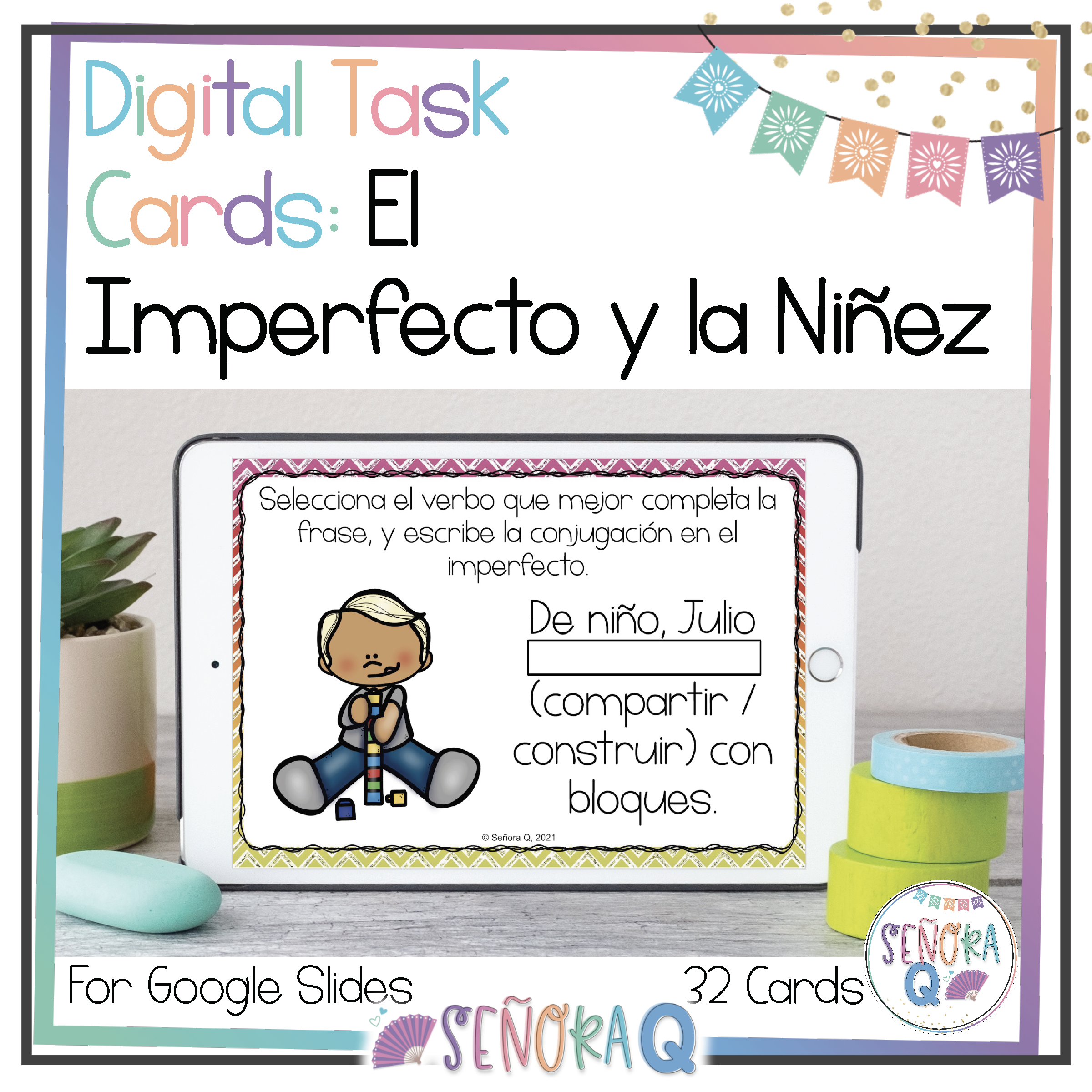 Digital Task Cards for Google Slides. You can have your students complete task cards at home, or during the school day when you’re not there by using digital versions! You can make task cards using Google Slides, typing up one question/prompt per slide. The nice thing about digital task cards is that you can easily add images! Here’s a set of digital task cards on childhood and the imperfect for you!