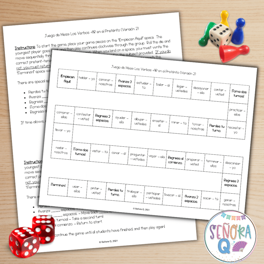 You can find blank board game templates online, or you can make your own. Once you have a template, simply fill the spaces with a verb to conjugate, a sentence with a blank to fill in, a question to answer, a picture to identify, or whatever will reinforce the content of your unit! I also like to add special spaces, like “Lose a turn” or “Move _____ spaces forward/back.” The best part is, once you have your games, you can reuse them for years to come!