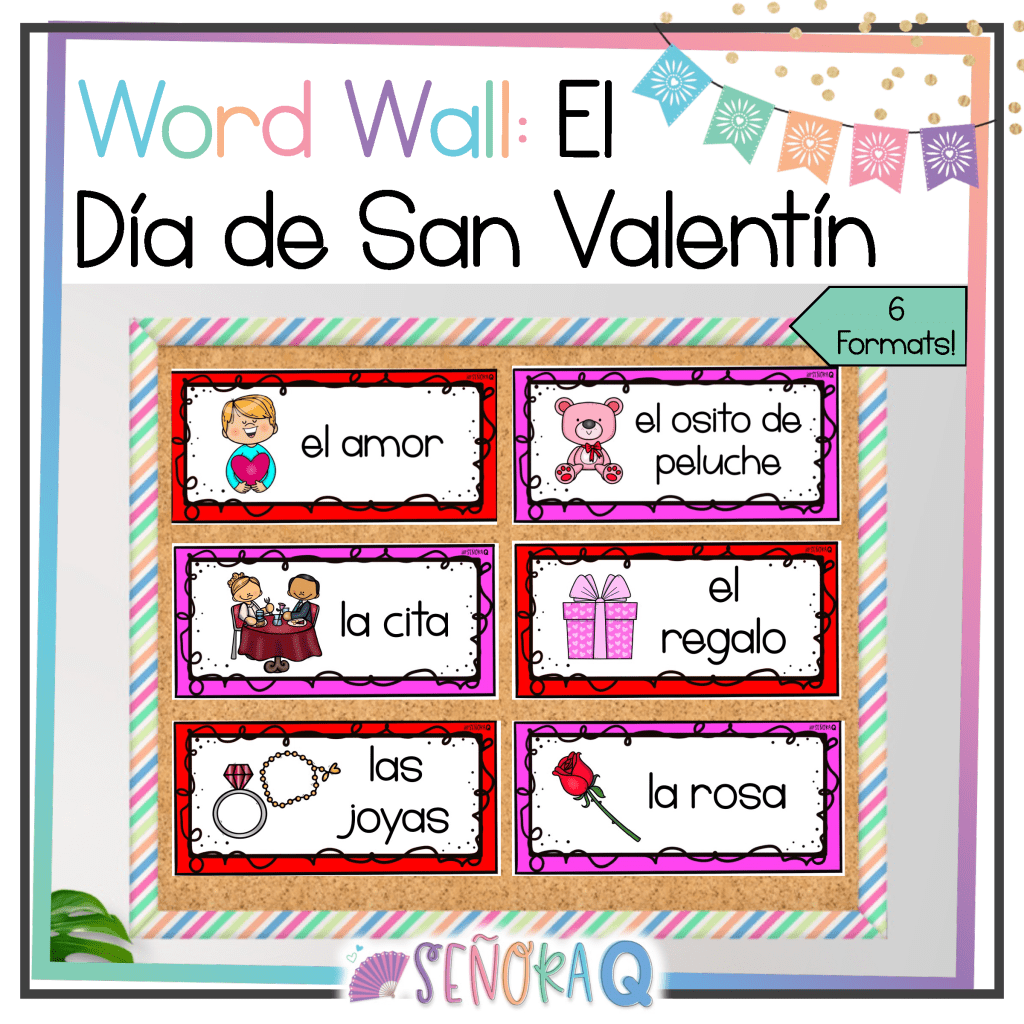 A Valentine’s Day word wall is a colorful and engaging way to immerse your students in themed vocabulary while brightening up your classroom! Make a Valentine’s Day-themed word wall featuring terms like el amor, el chocolate, and el ramo de flores. The word wall serves as a visual aid that helps students connect images with Spanish terms, reinforcing their vocabulary retention. Whether used as a reference during activities or simply to create a festive classroom atmosphere, a Valentine’s Day word wall is both fun and educational!