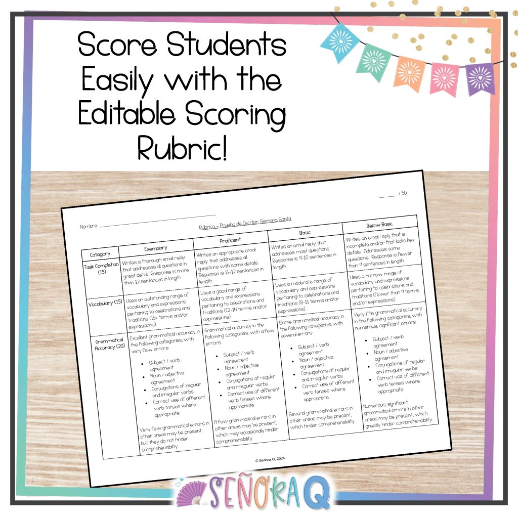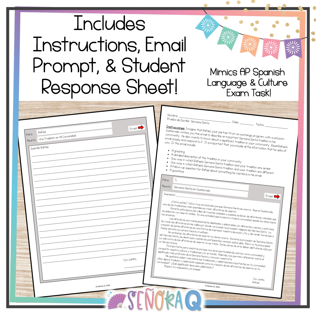 - Interpersonal Writing Practice: The activity prompts students to respond to Rafael’s email and share about a tradition in their own communities. This encourages meaningful interpersonal communication while practicing written Spanish skills.