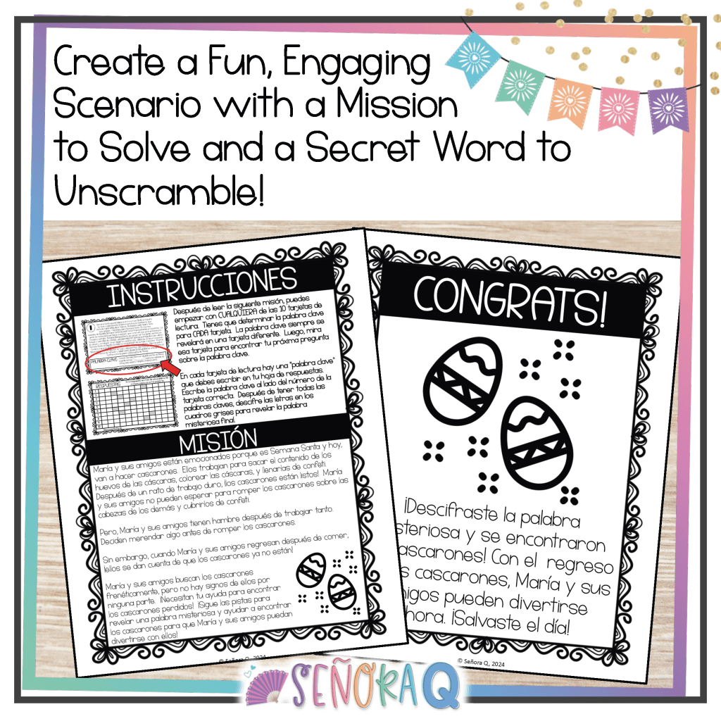 - Scavenger Hunt Format: Students will embark on an exciting adventure, exploring 10 cards with short reading passages on the celebration of Semana Santa in different Spanish-speaking countries. But here’s the twist—the answers to each question are strategically placed on different cards, encouraging movement and active participation.