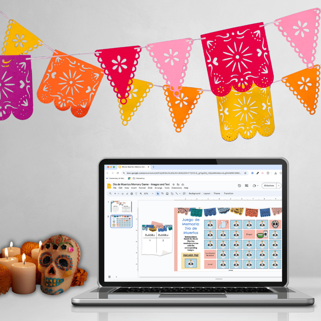 If your classroom is tech-friendly, try a Día de Muertos Vocabulary Digital Memory Game! This game allows students to practice vocabulary by matching terms to their English equivalents or corresponding images. With two versions available, it’s a great way for students to test their memory and solidify their vocabulary knowledge while incorporating technology into the learning process!