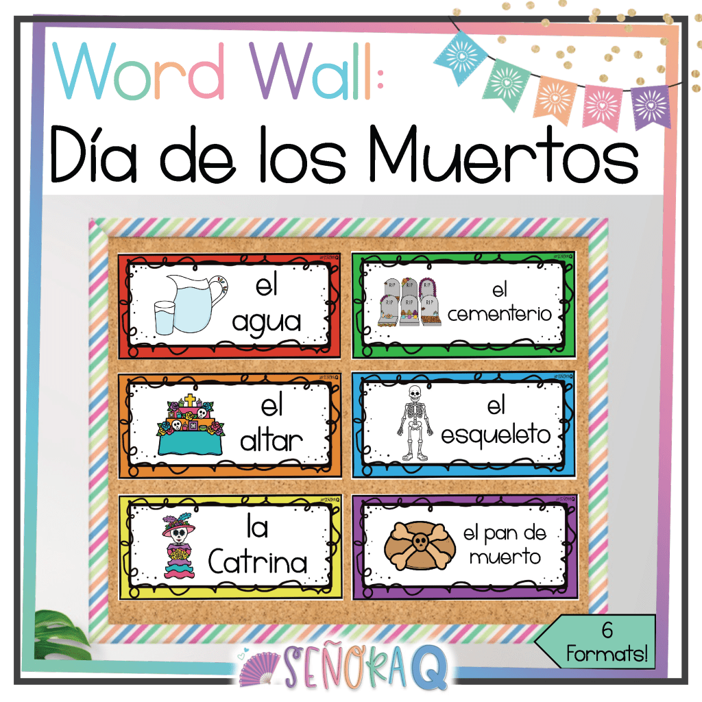 Decorate your classroom and reinforce vocabulary at the same time with a Día de Muertos Word Wall Display! The display features 39 Día de Muertos-related terms accompanied by vibrant images that help students visually connect with the vocabulary. It’s an excellent visual resource for keeping vocabulary top of mind and providing a colorful, culturally-rich environment in your classroom.