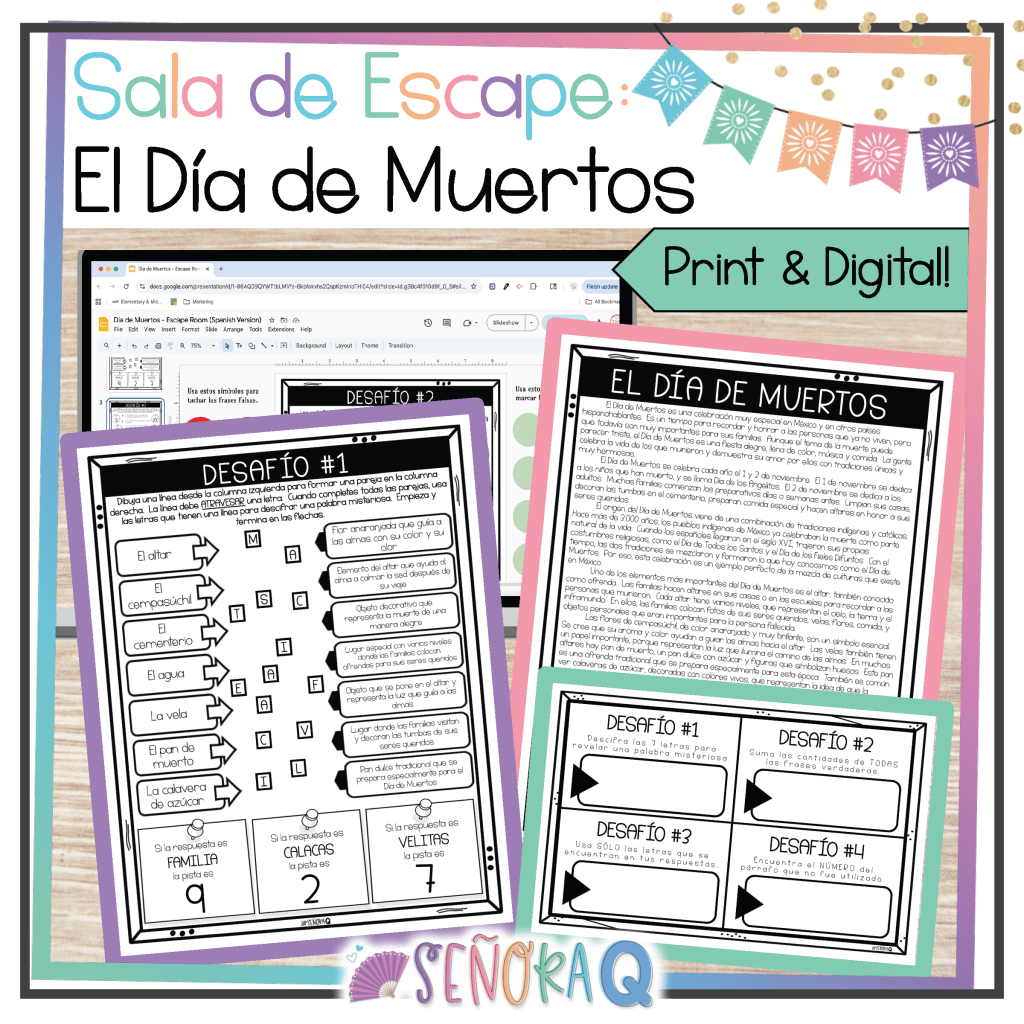 Make learning about Día de Muertos interactive and engaging with this fun Escape Room Activity! Students will read a comprehensible passage about the celebration and complete four themed puzzles to “escape.” This activity is perfect for both in-person and digital learning, and it’s available in English and Spanish, making it suitable for all levels of Spanish learners!