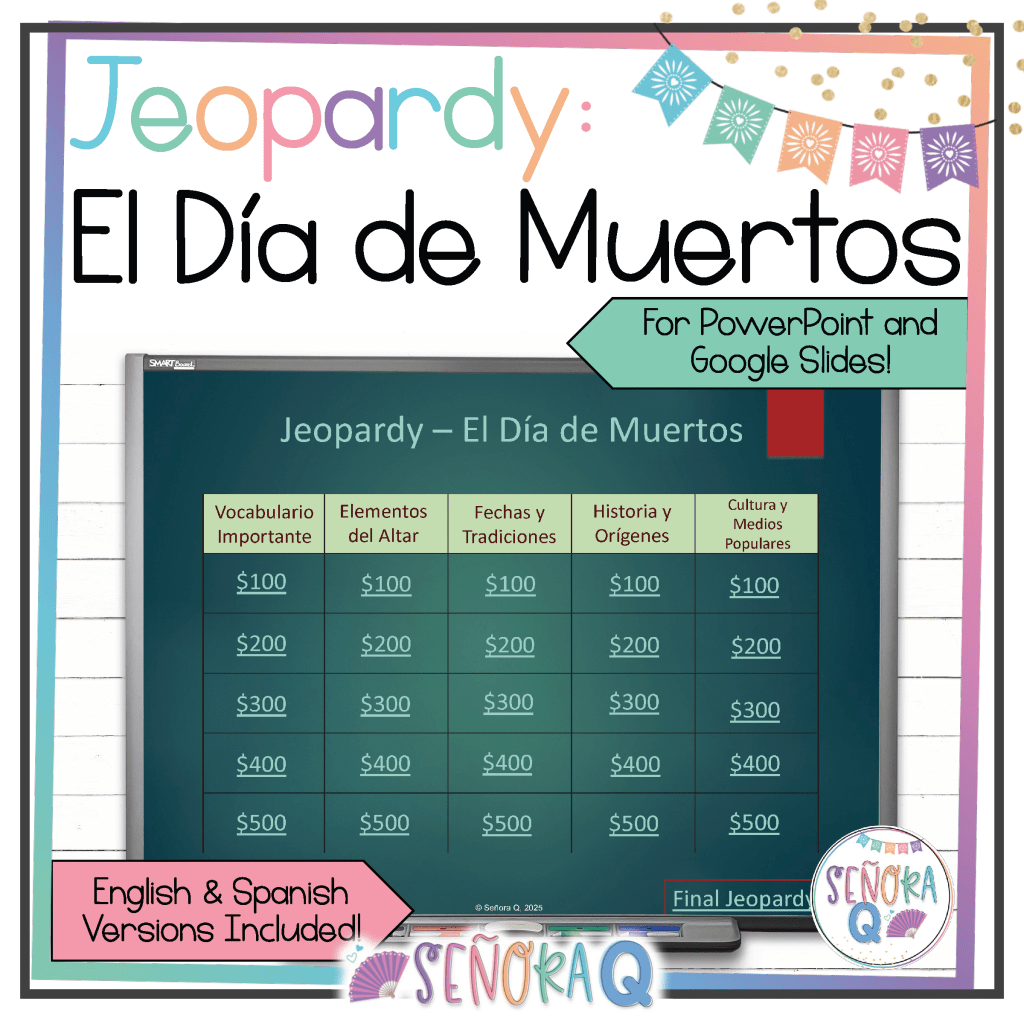 Bring the excitement of a trivia game show into your classroom with this Día de Muertos Jeopardy-style game, perfect for engaging secondary Spanish learners while teaching about one of Mexico’s most important celebrations! Designed for use in PowerPoint or Google Slides, this resource is fully editable, giving you the flexibility to adapt questions and categories to your students’ needs. Whether you use this game as part of a Día de Muertos unit, a cultural enrichment activity, or a fun review before the holiday, this Jeopardy-style game will get your students learning and excited about Spanish language and culture!