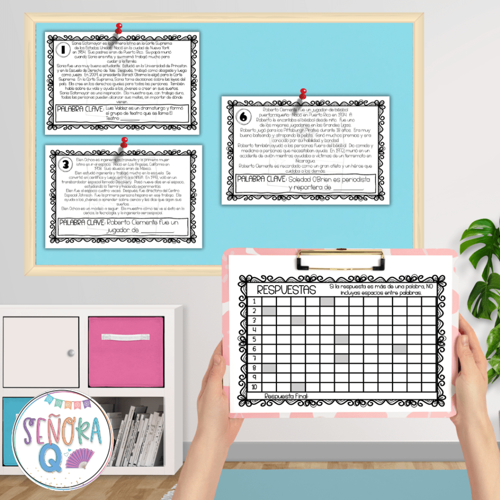 If your students are like mine and love interactive activities, this one is a huge hit! A Hispanic Heritage Month scavenger hunt reading activity uses 10 short reading cards with information about the lives and achievements of different Hispanic individuals. The catch? The answers to each question are on different cards! Students move around the room, read, and interact as they uncover the answers, making it a fun and interactive activity that your students are sure to love!