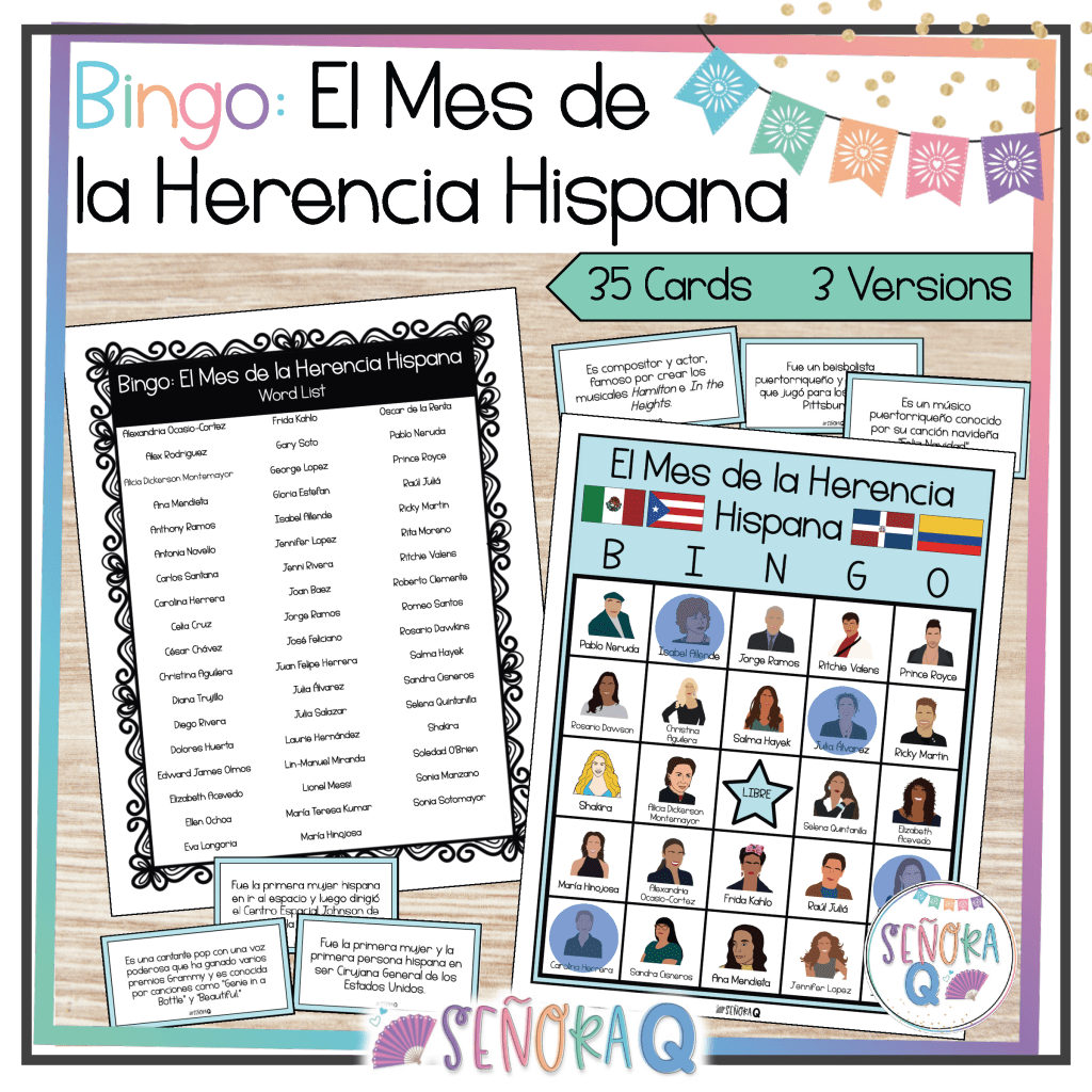 Looking for a ready-to-print Hispanic Heritage Month bingo set? I’ve got you! This set comes in three formats (pictures only, pictures with names, and names only) and features 53 different individuals! Includes the clues to read to your students (in both English and Spanish)!