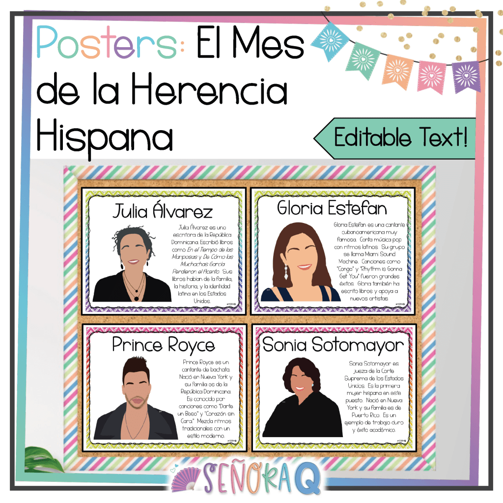 Don’t have time to make your own bulletin board set? No problem, I have one for you! Check out this Hispanic Heritage Month poster set featuring 53 famous and influential Hispanic and Latino individuals! Print the posters and go, or edit the text to suit your classroom needs! Spanish and English sets are included!